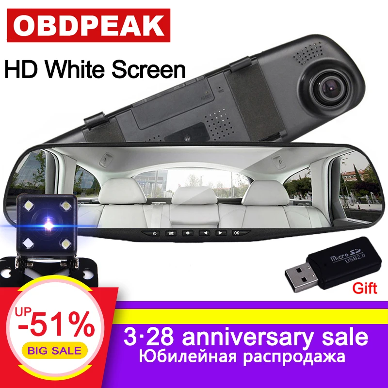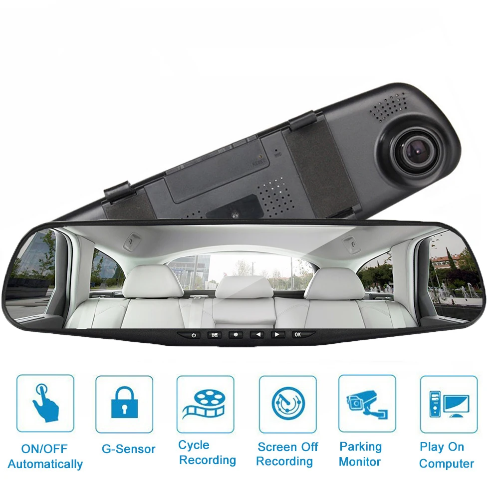 TOP 4.3'' Car DVR Rearview Mirror with 2 Cameras Dash Cam White mirror 1080P Auto Video Registrator Rec